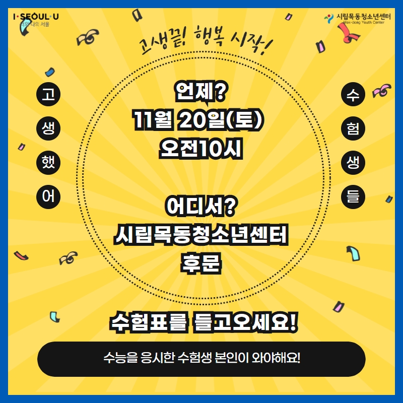 | 2021³â °í»ýÇÑ ¼öÇè»ýµé ¸ð¿©¶ó! ¸ñµ¿Ã»¼Ò³â¼¾ÅͰ¡ ½ð´Ù! | ||