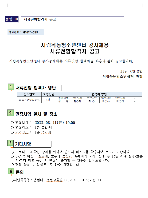 | ½Ã¸³¸ñµ¿Ã»¼Ò³â¼¾ÅÍ Æò»ý±³À° ½Ã°£°»ç °ø°³Ã¤¿ë ¼·ùÀüÇü ÇÕ°ÝÀÚ °ø°í | ||