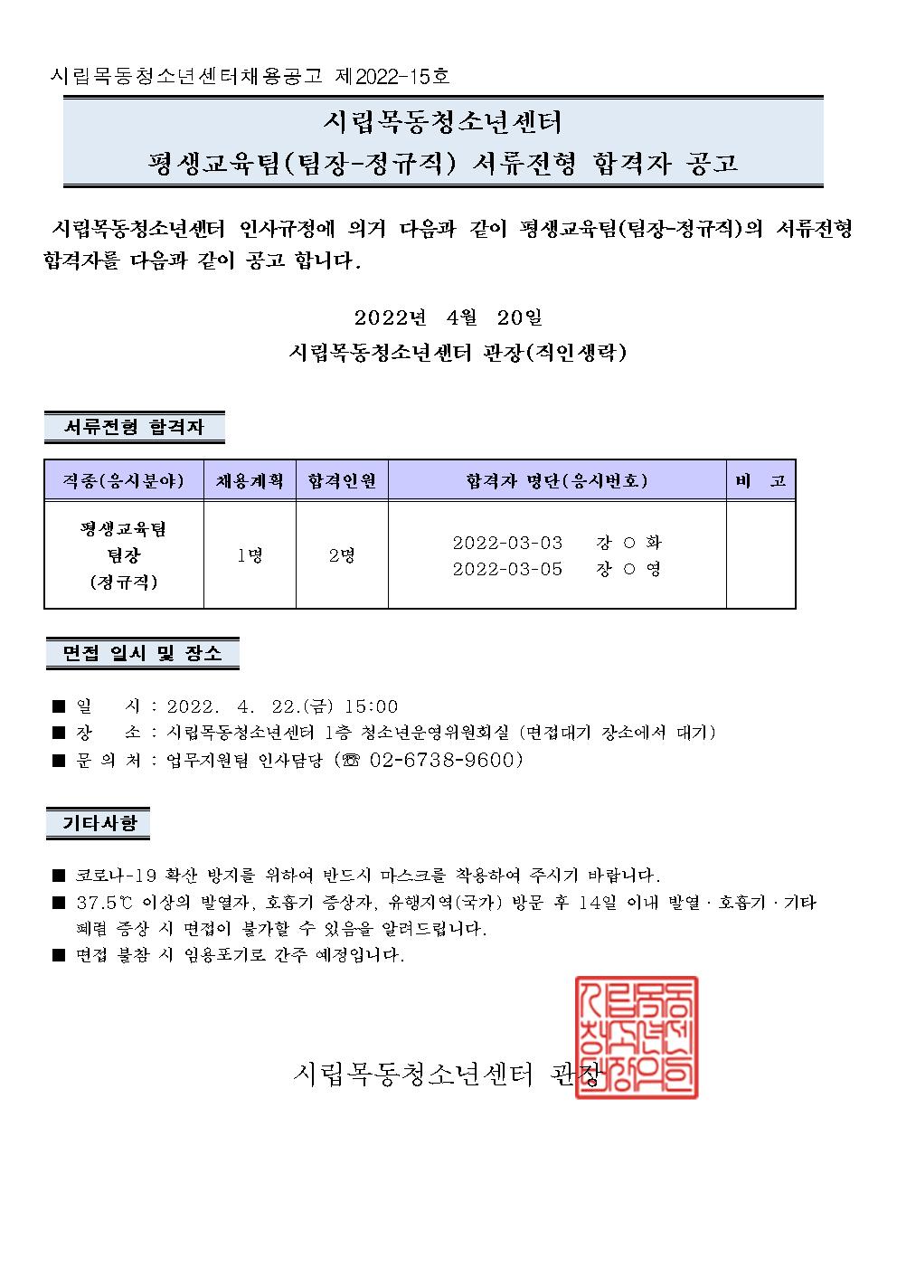 | [½Ã¸³¸ñµ¿Ã»¼Ò³â¼¾ÅÍ] Æò»ý±³À°ÆÀ(ÆÀÀå-Á¤±ÔÁ÷) ä¿ë ¼·ùÀüÇü ÇÕ°ÝÀÚ °ø°í | ||