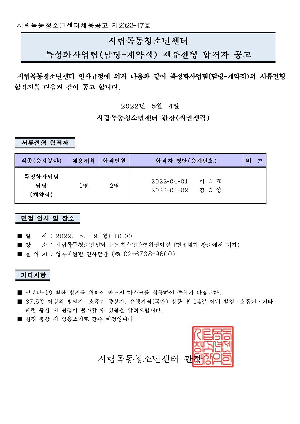 | [½Ã¸³¸ñµ¿Ã»¼Ò³â¼¾ÅÍ]Ư¼ºÈ»ç¾÷ÆÀ(´ã´ç-°è¾àÁ÷) ¼·ùÀüÇü ÇÕ°ÝÀÚ °ø°í | ||