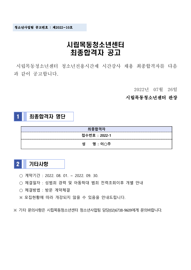 | [½Ã¸³¸ñµ¿Ã»¼Ò³â¼¾ÅÍ] û¼Ò³âÀü¿ë½Ã°£Á¦ ½Ã°£°»ç 2Â÷ ÃÖÁ¾ ÇÕ°ÝÀÚ °ø°í | ||