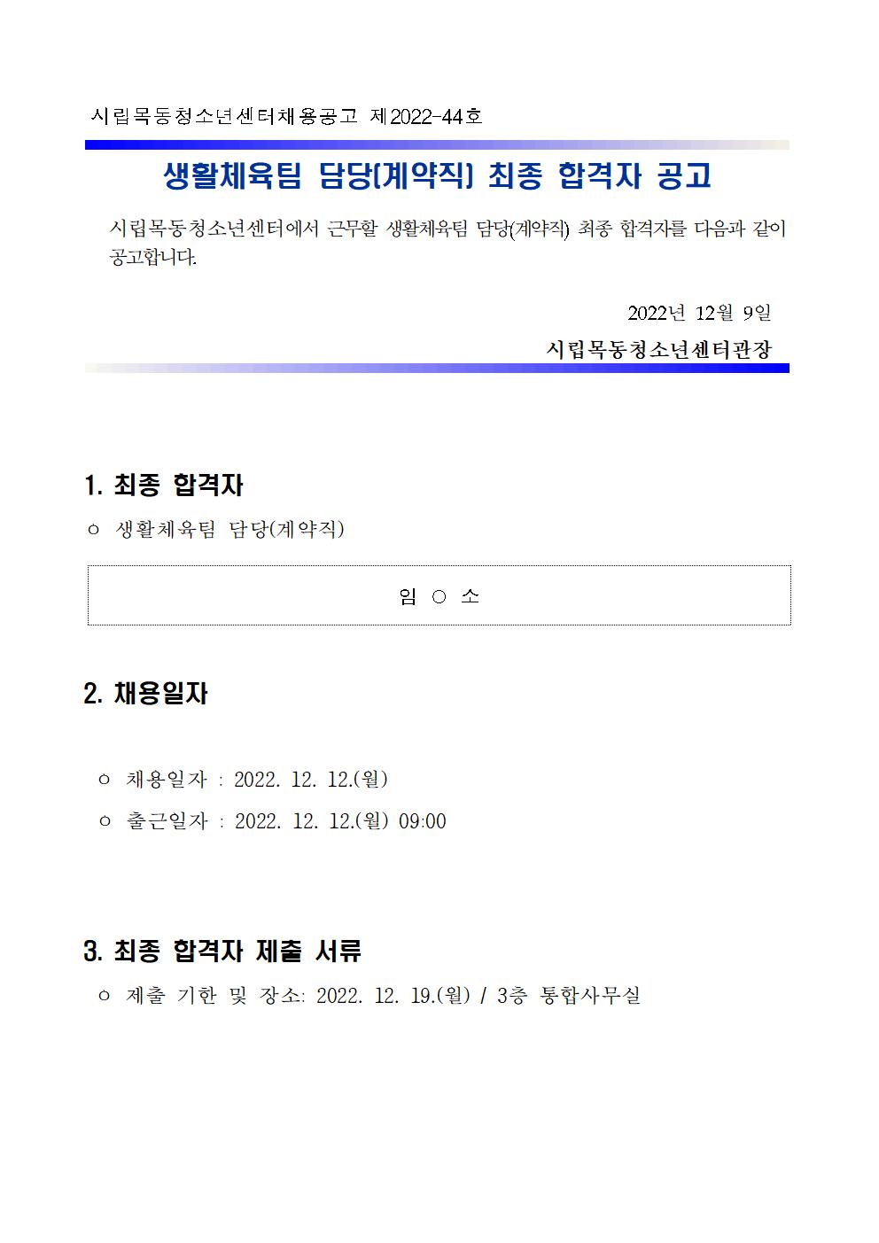 | [½Ã¸³¸ñµ¿Ã»¼Ò³â¼¾ÅÍ] »ýȰüÀ°ÆÀ ´ã´ç(°è¾àÁ÷) ÃÖÁ¾ ÇÕ°ÝÀÚ º¸°í | ||