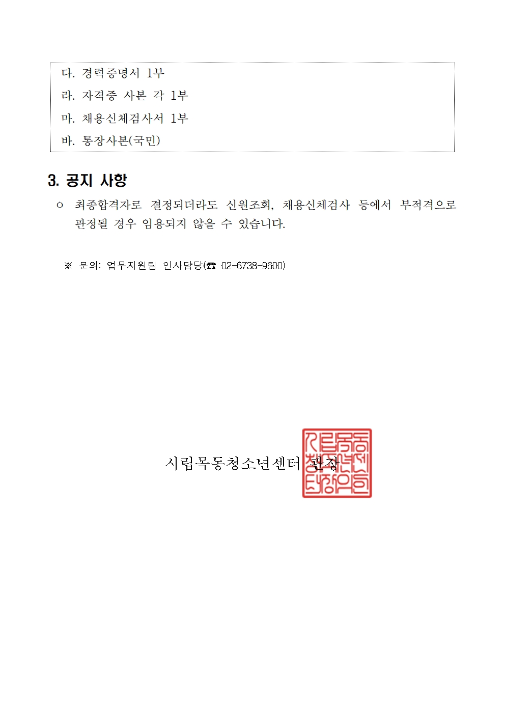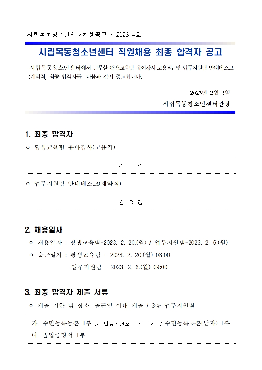 | [½Ã¸³¸ñµ¿Ã»¼Ò³â¼¾ÅÍ]Æò»ý±³À°ÆÀ À¯¾Æ°»ç ¹× ¾÷¹«Áö¿øÆÀ ¾È³»µ¥½ºÅ© Á÷¿øÃ¤¿ë ÃÖÁ¾ ÇÕ°ÝÀÚ °ø°í | ||