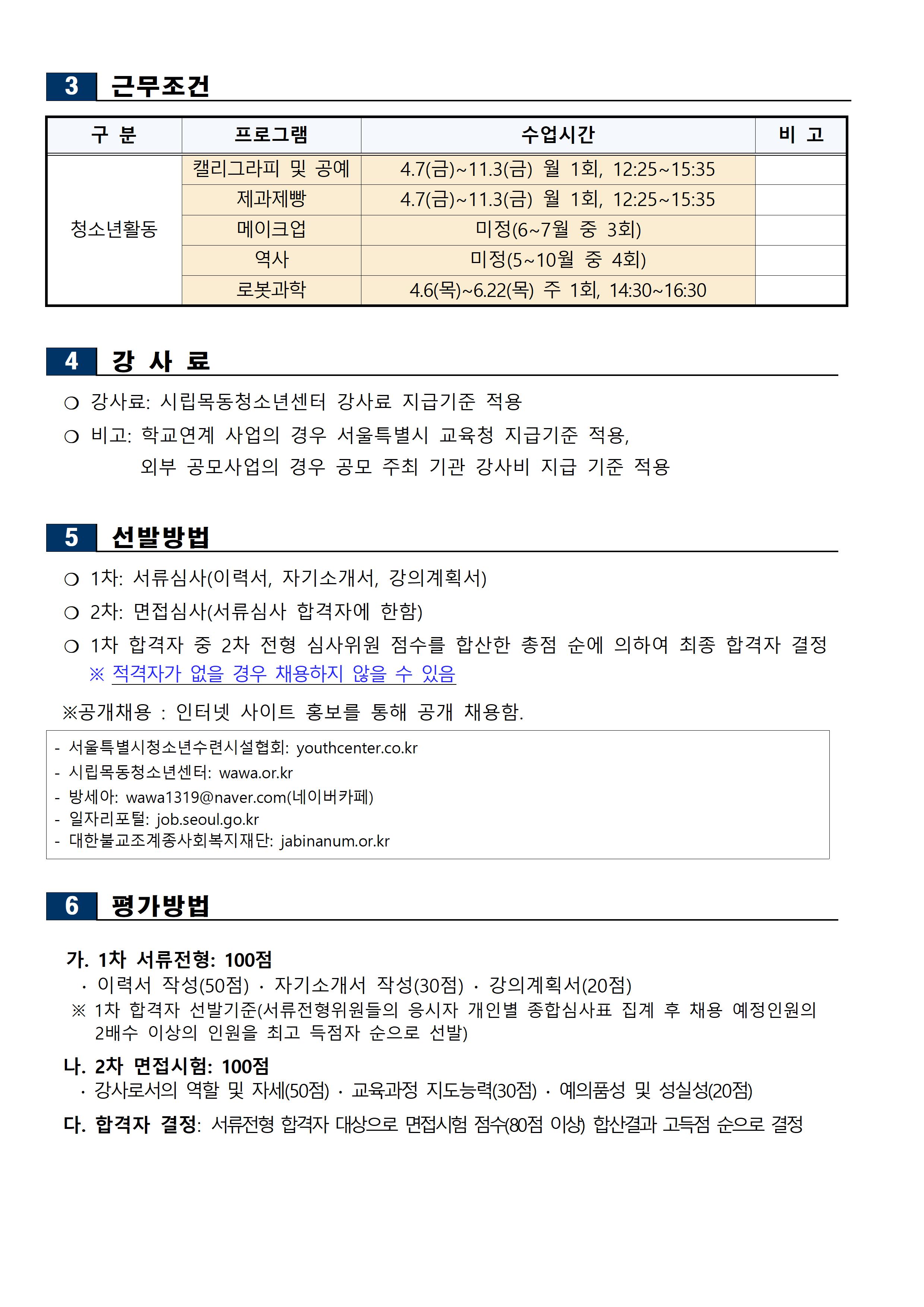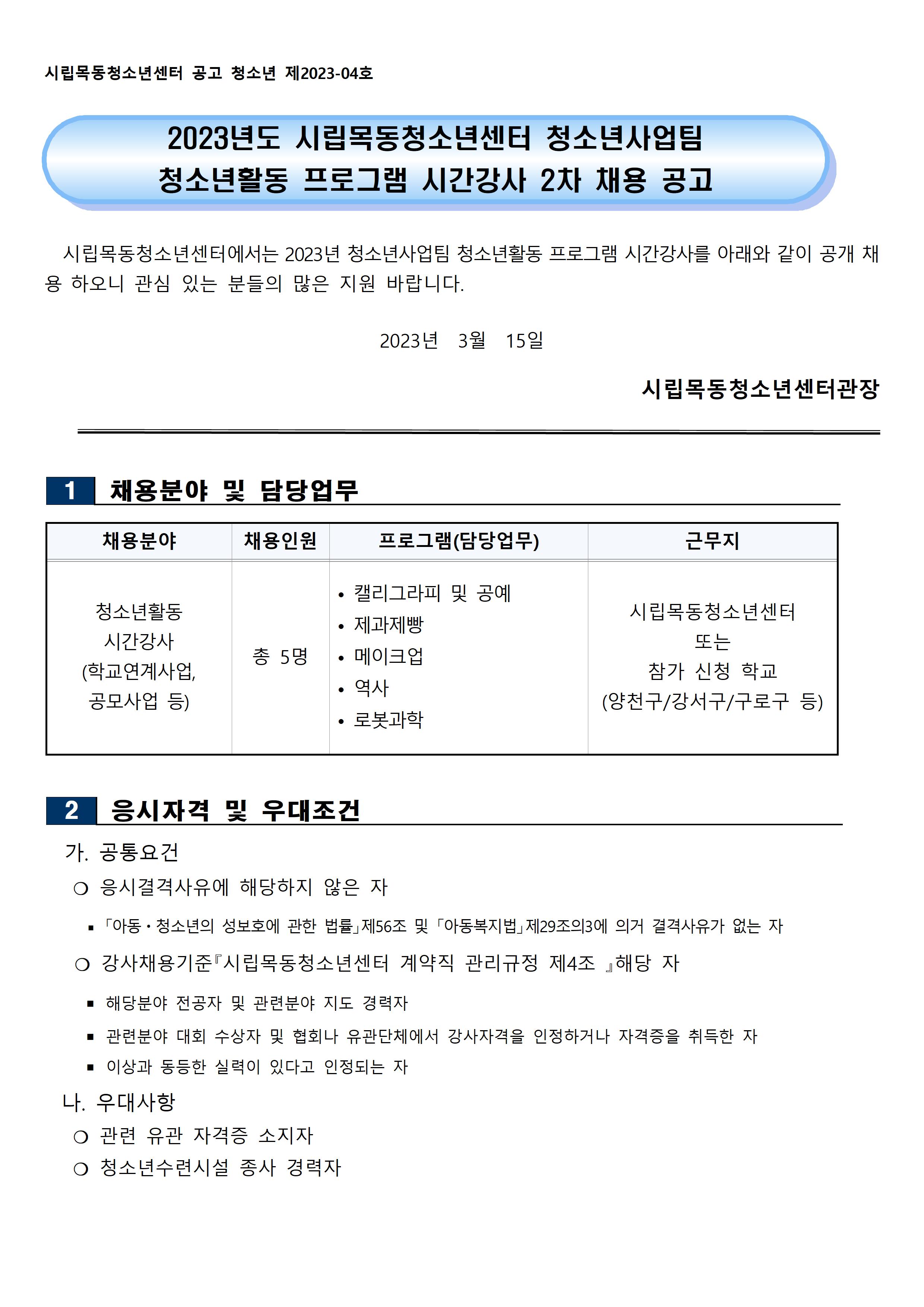 | [½Ã¸³¸ñµ¿Ã»¼Ò³â¼¾ÅÍ] û¼Ò³â»ç¾÷ÆÀ û¼Ò³âȰµ¿ ÇÁ·Î±×·¥ ½Ã°£°»ç 2Â÷ ä¿ë °ø°í | ||