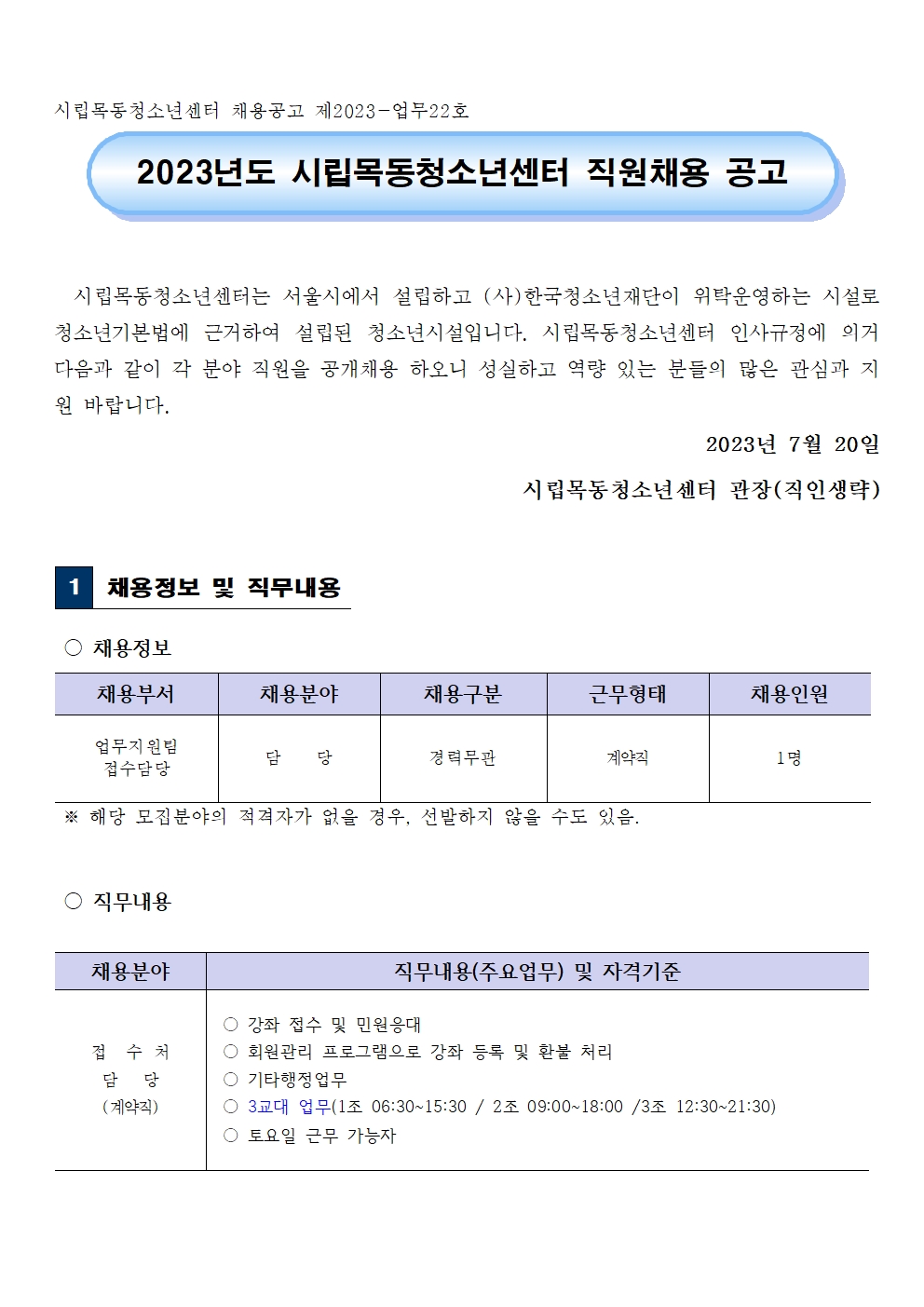 | ´ÙÀ½±Û | [½Ã¸³¸ñµ¿Ã»¼Ò³â¼¾ÅÍ] Ư¼ºÈ»ç¾÷ÆÀ û¼Ò³âÀü¿ë½Ã°£Á¦ ´ã´ç(°è¾àÁ÷) ä¿ë °ø°í |