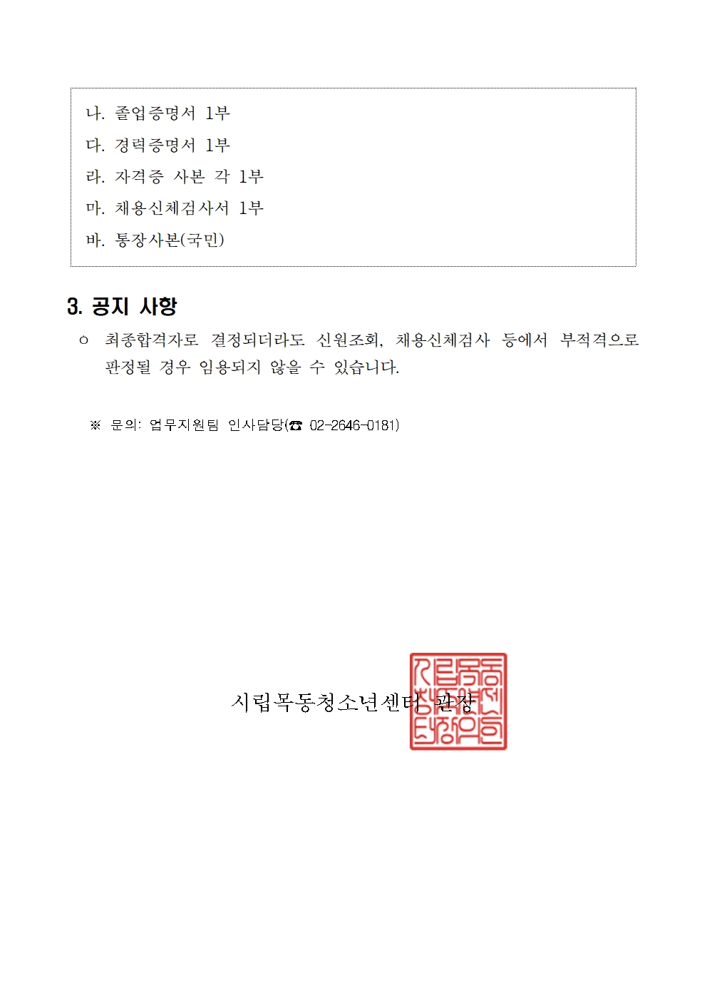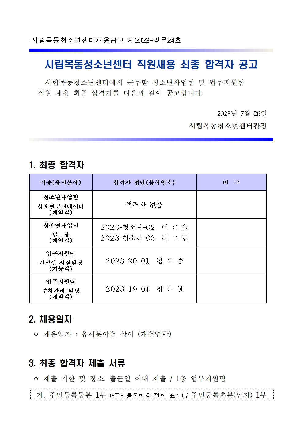 | [ÇÕ°ÝÀÚ°ø°í] û¼Ò³â»ç¾÷ÆÀ(ÄÚµð³×ÀÌÅÍ, ´ã´ç) ¹× ¾÷¹«Áö¿øÆÀ(½Ã¼³´ã´ç, ÁÖÂ÷°ü¸®´ã´ç) Á÷¿ø ä¿ë ÃÖÁ¾ÇÕ°ÝÀÚ °ø°í | ||
