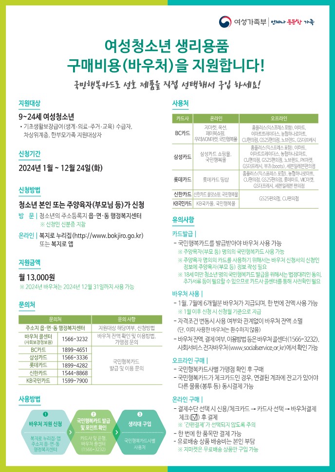 | [¿©¼º°¡Á·ºÎ] ¿©¼ºÃ»¼Ò³â »ý¸®¿ëǰ ¹Ù¿ìó Áö¿ø ¾È³» | ||