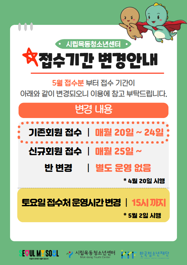 | Á¤±ÔÇÁ·Î±×·¥ "Á¢¼ö±â°£" ¹× "Åä¿äÀÏ Á¢¼öó ¿î¿µ½Ã°£" º¯°æ ¾È³» | ||