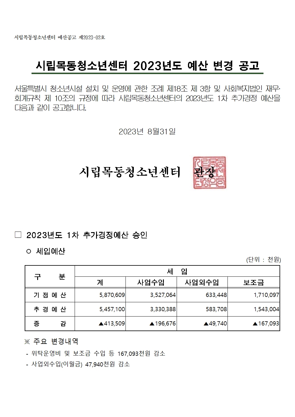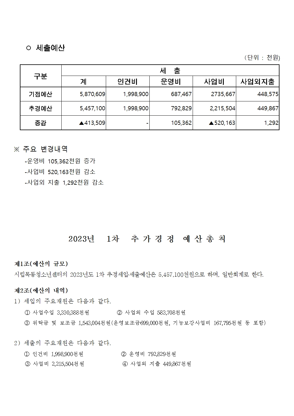 | ½Ã¸³¸ñµ¿Ã»¼Ò³â¼¾ÅÍ 2023³âµµ ¿¹»êº¯°æ °ø°í | ||