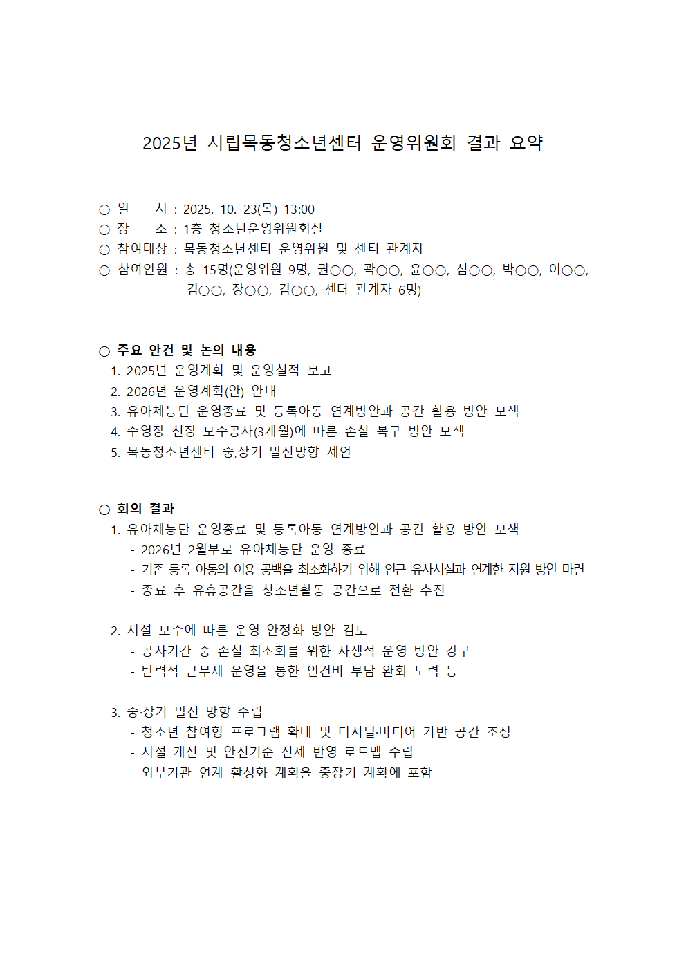 | 2025³â ½Ã¸³¸ñµ¿Ã»¼Ò³â¼¾ÅÍ ¿î¿µÀ§¿øÈ¸ °á°ú °øÁö | ||