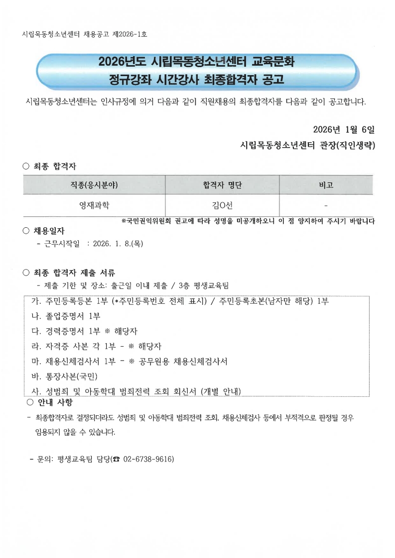 | [½Ã¸³¸ñµ¿Ã»¼Ò³â¼¾ÅÍ] 2026³â Æò»ý±³À°ÆÀ ±³À°¹®È Á¤±Ô°Á ½Ã°£°»ç ÃÖÁ¾ÇÕ°ÝÀÚ °ø°í(¿µÀç°úÇÐ) | ||